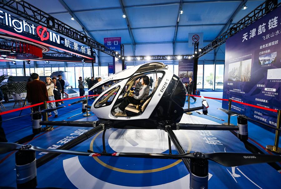 The seventh China Helicopter Exposition, which concluded on Sunday in north China's Tianjin Municipality, featured a 5,000-square-meter pavilion dedicated to the low-altitude economy, attracting crowds with a striking orca-shaped eVTOL, an electric vertical take-off and landing aircraft developed in China.